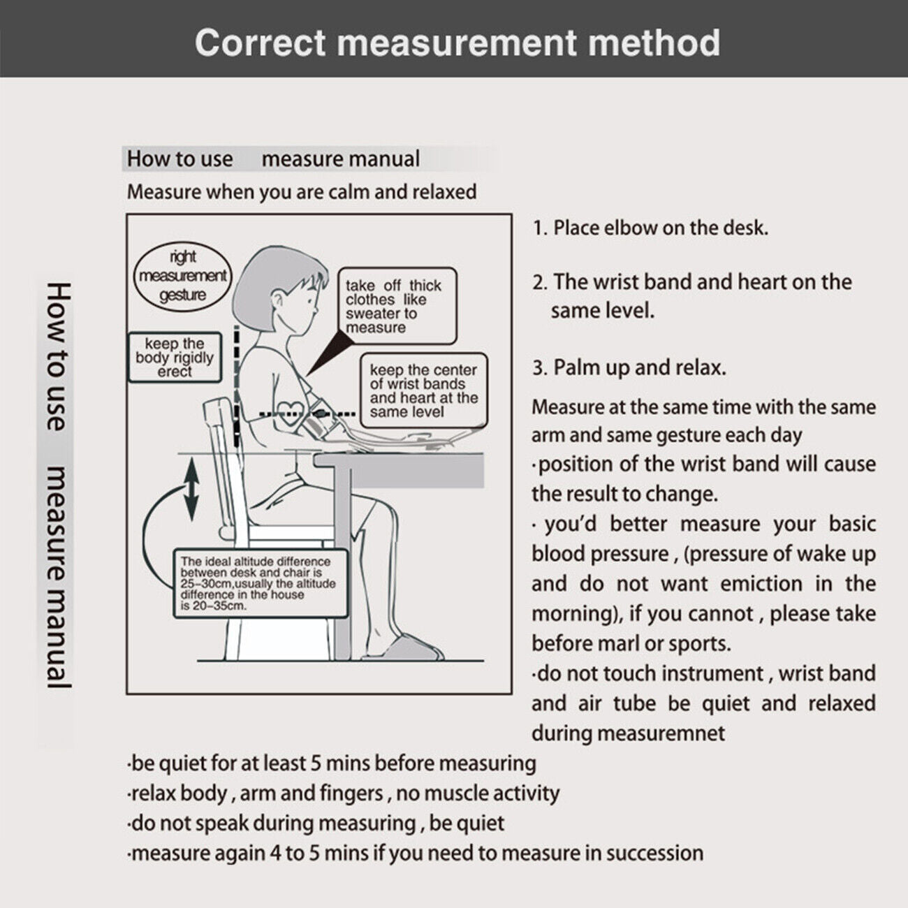Drinking alcohol or coffee, eating, smoking, exercising and bathing in 30 minutes should be avoided before you take a measurement.